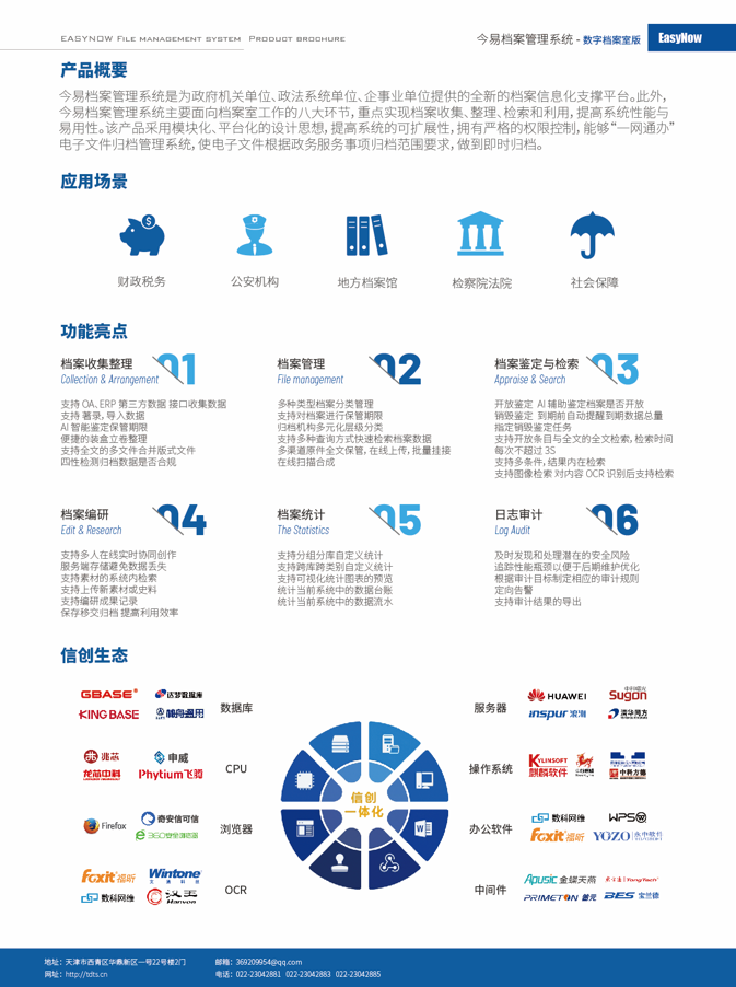 天津市天深科技股份有限公司自1999年开始与天津市档案局合作开发“今易“档案管理系统,至今已有20余年。在天津市以及全国市场,成功部署了6000余套,广泛应用于政府机关和企事业单位。经过20余年的不断开发和完善,下已经形成了适用于各行各业、各种管理需求的系列产品。尤其是近几年,随着计算机系统国产化环境的不断推进,”今易“产品形成了适配绝大多数信创环境的档案管理系统,紧跟发展趋势,昂扬面向未来。