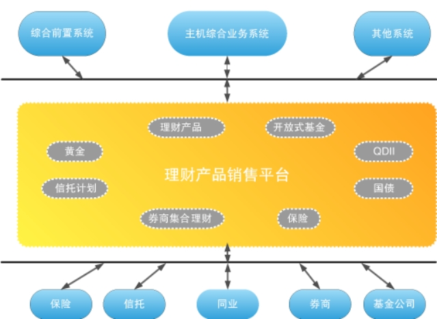 为银行提供各种理财产品的统一销售管理平台,系统连接行内、行外的多个系统及渠道,实现开放式基金、行内理财产品、券商理财产品、保险理财产品、信托理财产品、他行理财产品等各类理财产品的自销或代销。使银行充分发挥其地域优势和服务渠道优势,为本地优质客户提供多样的、灵活的理财服务,同时与同业机构或其他金融机构展开紧密合作,扬长补短。系统遵循“小核心、大外延”的设计思想,系统核心本身为多层次、组件化结构设计,系统的体系结构为“框架+组件”。每个功能组件体现为单独的动态库,每个业务组件由多个功能组件组成,用户可以根据自己的需要选择所需的业务组件,搭建适合自己的理财系统,同时也便于扩展新功能。