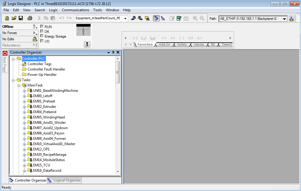 该软件产品是在Windows 7以及AB Studio 5000平台下开发的,可运行于工业控制计算机、PC机、以及AB系列PLC上。本软件集数据采样、监控及系统故障诊断于一体。它能够在设备运行期间实时的进行动态数据采集,并把采集上来的数据反馈到PLC 中,再通过逻辑处理并对采样数据进行分析,判断是否正确,以便设备在生产过程中能正常运行。监控系统可以随时监控设备的状态,在手动时,操作人员可以通过监控画面查看各个控制回路和电机的状态以及是否满足过程启动的准备条件。例如可以在工艺规格编辑画面中展示产品切面图,通过设备的运行状态和画面的同步,操作人员可以从产品的切面图中实时观察到产品的生产进程度。工程操作人员能根据实时显示的数据进行工艺参数的设置以及修改,完成设备的操作控制。本软件还可以实现对工艺规格的管理,包括工艺规格的编辑、更换、保存、调用等功能。此外,还具有系统故障诊断功能。在监控画面中操作人员可以快速找到导致设备不能正常运行的原因,从而及时排除故障,快速恢复设备的正常生产。例如高压报警和超高压所导致的设备停车。产品经现场调试,具有较高的安全性、可靠性,使用简单,易于维护和高可移植性。
