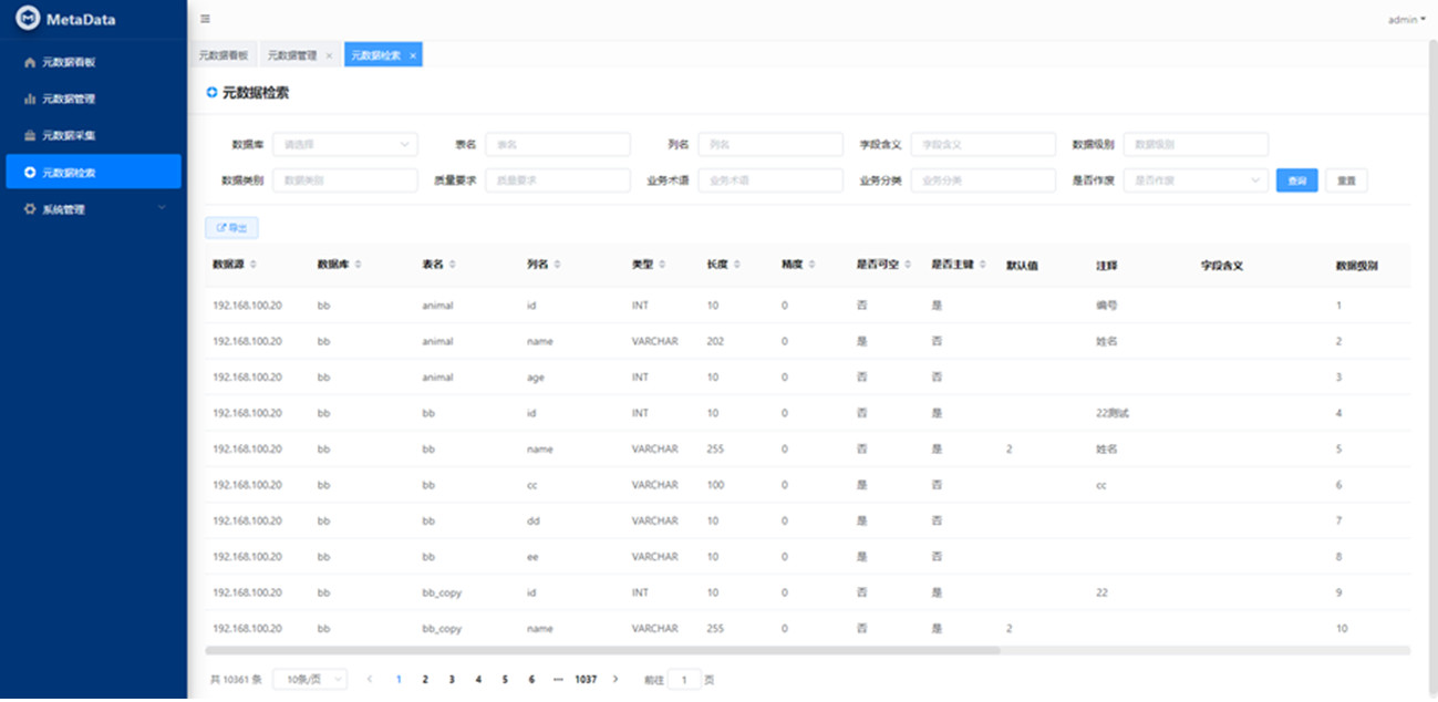 目录树默认展开所有的采集过来的数据源以及数据源下的库表,支持查看数据源、数据库、数据表、列信息,支持批量修改业务元数据信息