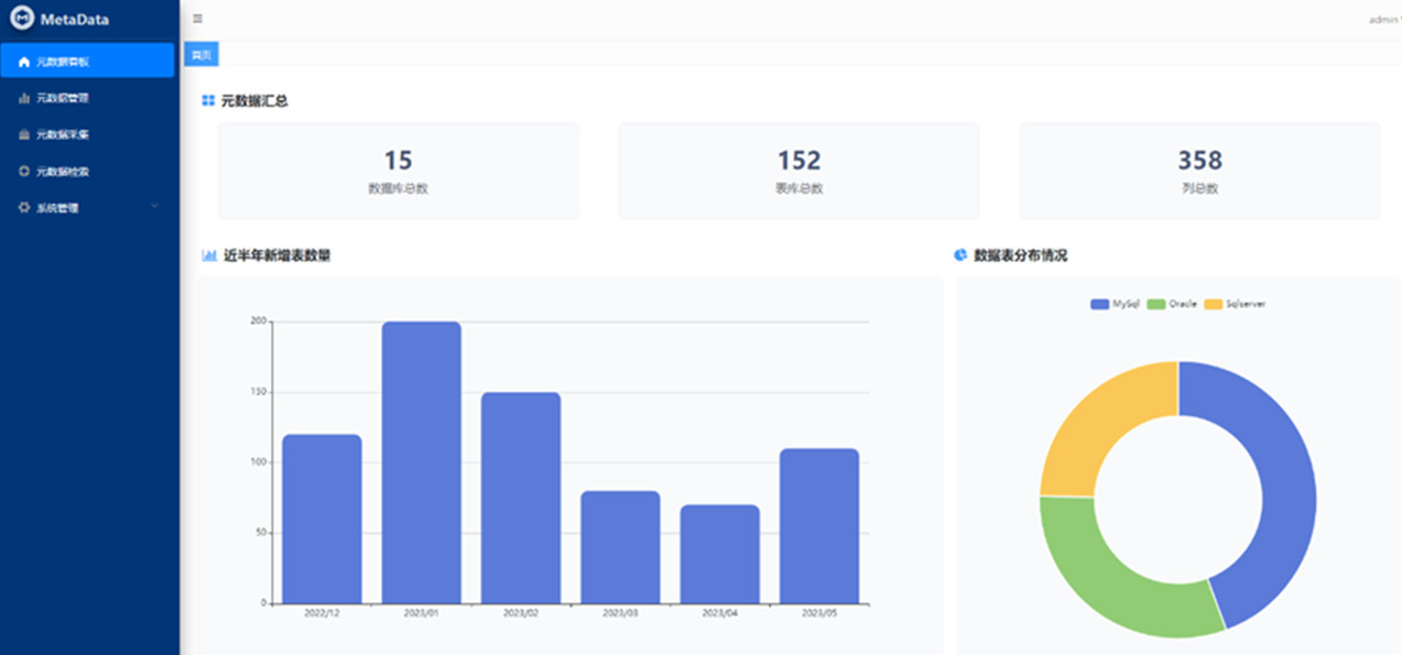 用户登录后,页面默认展示元数据看板页面。元数据看板包含数据库总数、表库总数、列总数3个汇总指标、近半年新增表数量柱形图、数据表分布情况饼图。