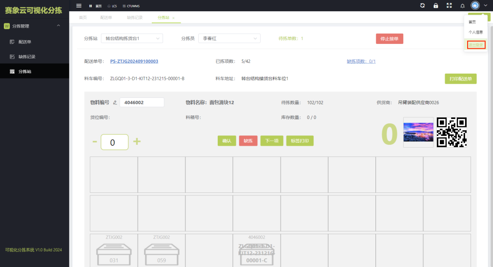 分拣站:分拣站接收匹配到对应的配送单,对物料进行分拣;分拣站直观显示预分拣物料信息和分拣数量;缺拣时可进行缺拣申请,同时可对物料标签和配送单进行打印。