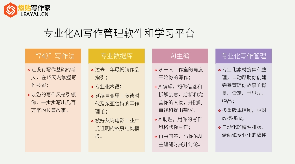 二、燃贴写作家内置丰富的写作数据库,涵盖流派、视角、叙述声音和叙事结构等信息,帮助作者构思故事、确定写作风格。在推介、剧情概要、人物和世界观构建方面,也能提供全面的支持和建议。