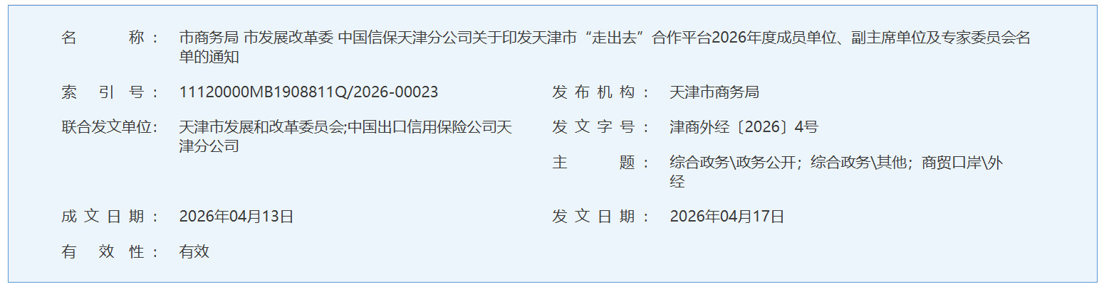 市商务局 市发展改革委 中国信保天津分公司 关于印发天津市“走出去”合作平台2026年度 成员单位、副主席单位及专家委员会 名单的通知
