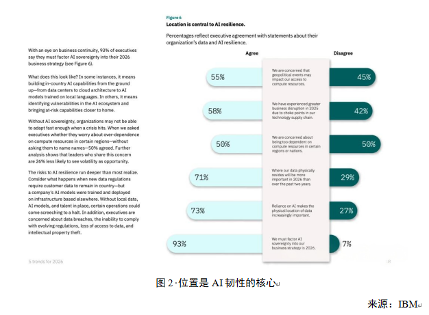 Accenture的一项新研究发现,企业更加重视保持对数据和基础设施的控制,这可能会加速对主权人工智能的需求。在欧洲,62%的组织正在寻求主权解决方案以应对当前的地缘政治不确定性,这一担忧在丹麦(80%)、爱尔兰(72%)和德国(72%)的组织中尤为突出。受监管要求且拥有敏感数据的行业最有可能引领主权人工智能的采用,包括银行业(76%)、公共服务(69%)和公用事业(70%)。只有19%的组织将主权人工智能视为竞争优势,而48%的组织将合规要求列为其采用主权解决方案的主要动机。IBM研究中有93%的高管表示,必须将AI主权(AI sovereignty)纳入2026年战略。这意味着关键数据、模型和基础设施要在可控范围内。50%的高管担心过度依赖某些地区的算力资源。贸易限制、新数据法规、供应链中断都可能让AI能力瞬间“失灵”。75%的芯片采购方高管认为,半导体供应商过于集中是重大战略挑战。
