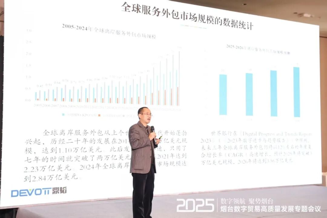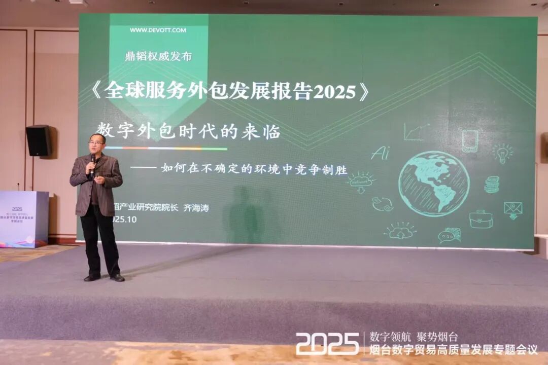 近日,鼎韬产业研究院在烟台数字贸易高质量发展专题会议上正式发布《全球服务外包发展报告2025》。报告以“数字外包时代的来临——如何在不确定的环境中竞争制胜”为主题,通过对全球服务外包市场的深度溯源、现状剖析与趋势前瞻,为业界描绘了一幅数字技术革命与逆全球化浪潮交织下的产业新图景。
