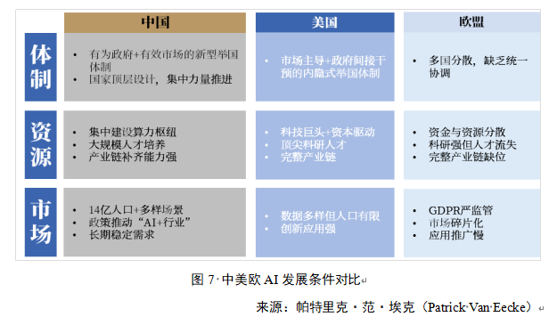 欧盟在人工智能发展中呈现出多国分散、缺乏统一协调的格局,数字市场碎片化、本土龙头企业偏少、资本市场深度不足、关键技能短缺而相对落后、风险资本容忍度低,以及完整产业链缺位,导致资源整合和调配效率偏低,科研资金和人才被分散消耗,使其科研成果难以有效转化为大规模应用。以上因素叠加,限制了欧盟在AI领域的整体竞争力。