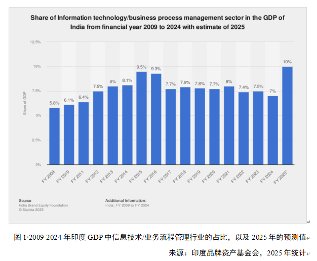 过去三十年间,印度凭借“离岸外包”(Offshoring)的先发优势,理所当然地成了“世界办公室”。印度IT服务出口额从2000财年的约40亿美元,飙升至2024财年的近2640亿美元,二十五年间增长超过六十六倍。IT行业对印度GDP的贡献率也从2000年的1.2%跃升至2010年的6.1%,最近的2024年,更是达到10%的惊人水平。
