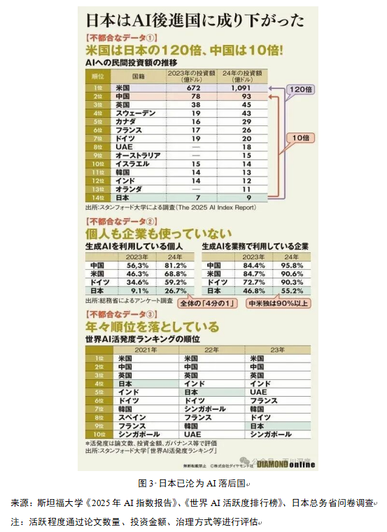 斯坦福大学世界AI活跃度排名中,2021年日本第4位,2022年日本第5位,到了2023年日本继续下降到第9位(沉沦至主要国家的底层),前三名稳居为美国、中国、英国。