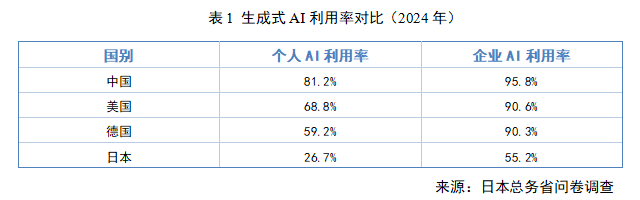 当其他国家都在积极使用先进生产力工具时,日本却对是否要使用生成式AI还在争论。由于日本大企业普遍对生成式AI的隐私问题和数据安全问题比较谨慎,在很多方面对员工使用生成式AI办公进行限制,生成式AI的使用率一直在低位徘徊。2024年,日本使用生成式AI的比例从2023年的仅仅9.1%提升至2024年的26.7%,而同期中国从56.3%升至81.2%,美国从46.3%提升至68.8%。根据日本总务省的数据,2025年,中国、英国和德国企业在开展业务时对生成式AI的利用率超过90%。而日本企业这一比例仅为55%-57%。