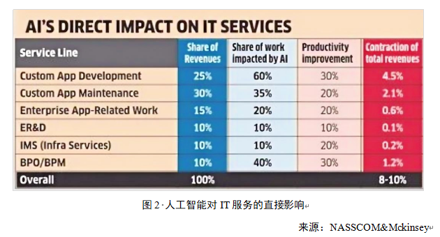 印度最大的KPO企业Everest Group的CEO彼得·本多-塞缪尔指出,IT产业约85%的利润来自劳动密集型的开发与运维阶段,而这正是AI替代效应最强的领域。过去需要一个庞大金字塔底层团队完成的工作,如今一个AI代理(AI Agent)就能以近乎零的边际成本、7x24小时不间断地高效执行。印度软件和服务业企业行业协会(NASSCOM)联合麦肯锡(Mckinsey)发布的《2025-2030印度科技服务业展望》显示,未来一家年收入10亿美元的AI服务公司可能仅需1000名员工,而同样规模的传统IT公司则需要近3万名员工。未来五年,印度应用维护,软件测试等传统IT外包业务预计每年会萎缩2%—3%。星座研究公司(Constellation Research)的CEO Ray Wang的预测更惊人:“一个百人规模的AI公司,将能创造出一家三万人、十亿美元收入的传统IT公司的产出。”