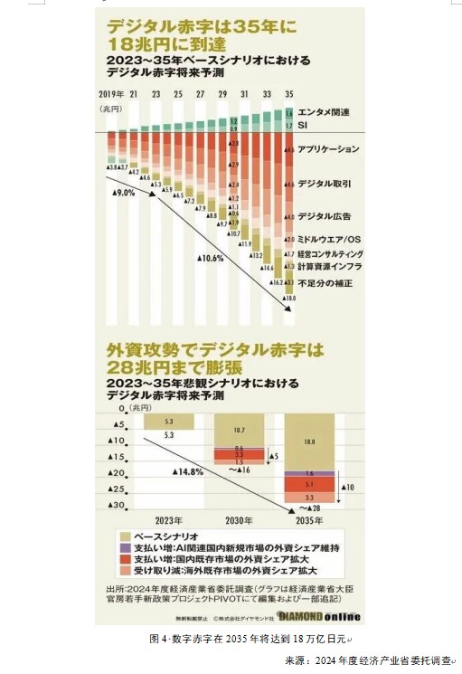 根据经济产业省年轻新政策项目PIVOT的测算,日本的数字赤字(Digital Deficit)将从2023年的5.3万亿日元扩大至2035年的18.0万亿日元。(基准情景Base Scenario)。悲观情景(Pessimistic Scenario)下,如果外资在AI相关国内新市场的份额维持,且在现有市场的份额扩大,赤字将膨胀至28万亿日元。这意味着,统计数据开始描绘出这样一个未来:日本的数字市场实际上变成了“外资的黑字(盈利)来源”。