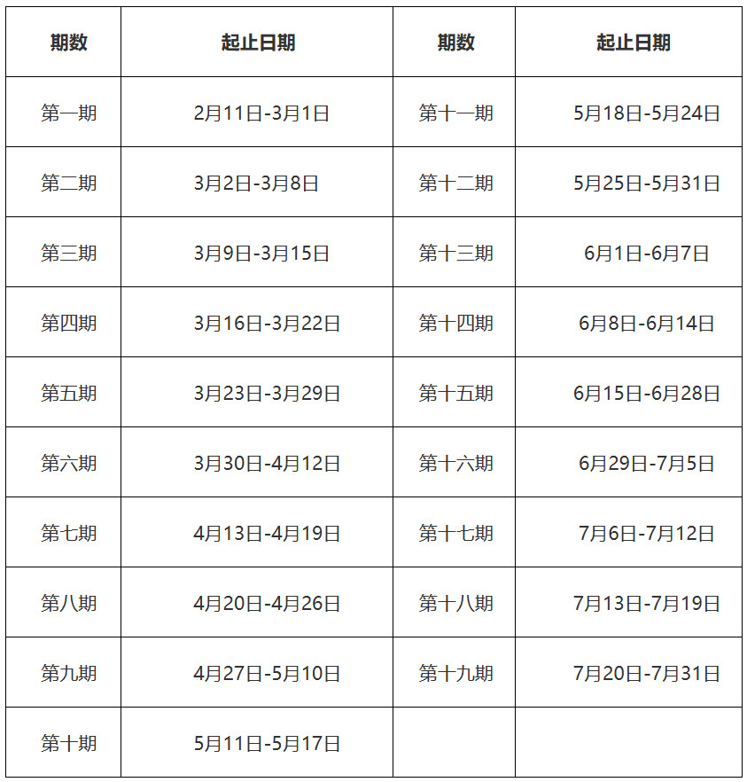 2026年2月11日10:00:00至2026年7月31日23:59:59。原则上以周为单位共划分19期,遇法定节假日适当延长期限。具体分期安排如下。