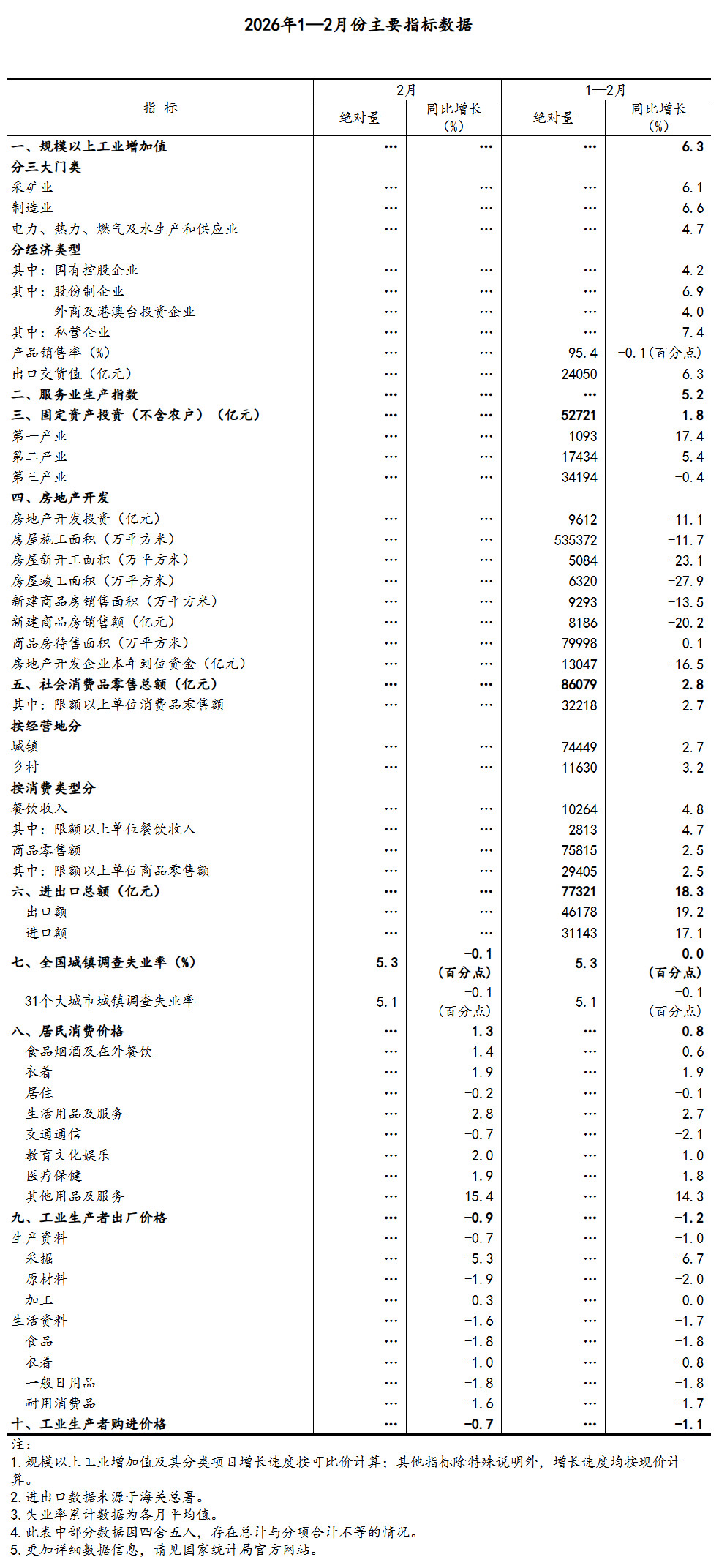 1—2月份,全国固定资产投资(不含农户)52721亿元,同比增长1.8%,上年全年为下降3.8%;扣除房地产开发投资,全国固定资产投资增长5.2%。分领域看,基础设施投资同比增长11.4%,制造业投资增长3.1%,房地产开发投资下降11.1%。全国新建商品房销售面积9293万平方米,同比下降13.5%;新建商品房销售额8186亿元,下降20.2%。分产业看,第一产业投资同比增长17.4%,第二产业投资增长5.4%,第三产业投资下降0.4%。民间投资同比下降2.6%,降幅比上年全年收窄3.8个百分点;扣除房地产开发投资,民间投资增长1.0%。高技术产业投资同比增长5.1%,其中航空、航天器及设备制造业,研发与设计服务业,信息服务业投资分别增长20.2%、20.6%、16.5%。从环比看,2月份固定资产投资(不含农户)比上月增长0.39%。