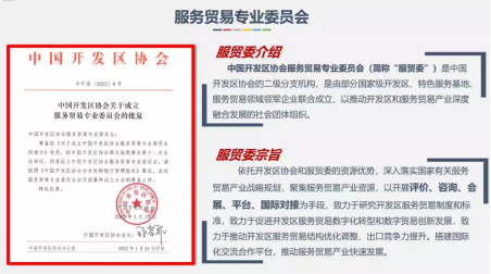 Industry information经中国开发区协会发起,由服务贸易领域中技术贸易、金融服务、文化贸易、现代中医药服务、教育服务、影视动漫、数字贸易等领域重点产业园区、特色服务出口基地、自贸区、服务机构、企业及专家学者等自愿组成的非营利性社会组织——中国开发区协会服务贸易专业委员会(以下简称“服贸委”)日前正式成立。天津鼎韬科技发展有限公司作为服贸委秘书处单位,正全力推进中国开发区协会服务贸易专业委员会工作。