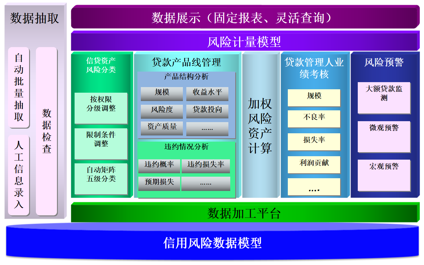 系统提供贷款集中类、不良贷款类、违约贷款类、违约损失贷款类、贷记卡类、借冒名贷款、贷前客户调查、贷款发放、贷款其他类等多维度的风险监测指标项。为银行管理人员提供更加全面、更加灵活的风险预警指标项目。
