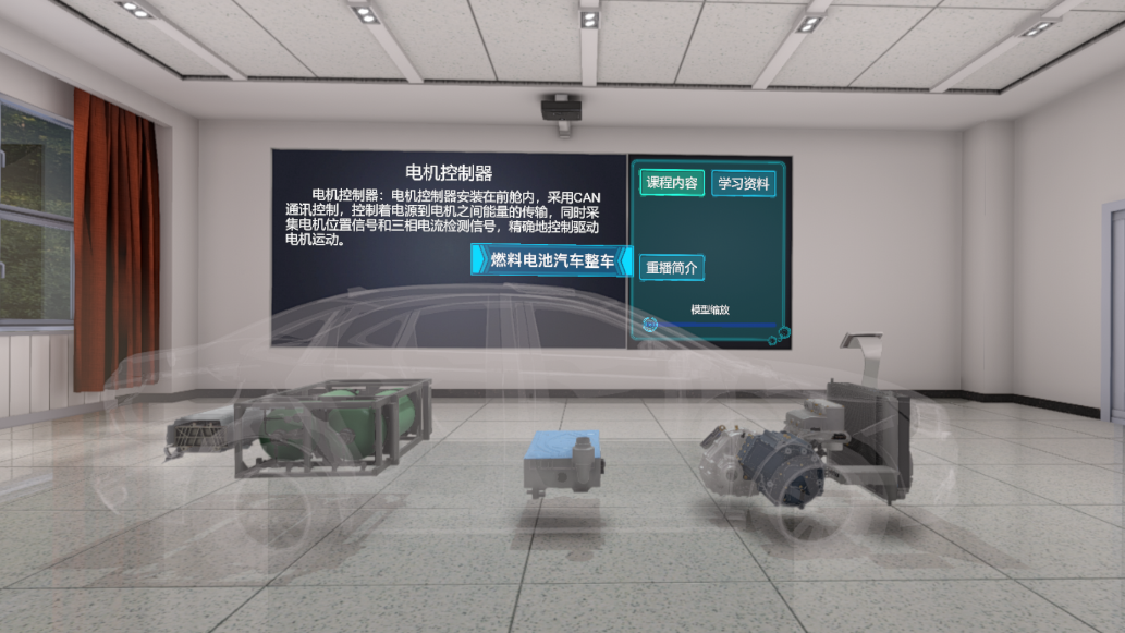 晨星宇信新能源汽车结构与原理-VR课堂教学系统按照新能源汽车主要类型,及院校教学需求主要设置有纯电动汽车,混合动力汽车,燃料电池汽车,油气混合汽车等大类学习内容。并按照课程实施内容需求设置对应教学模块,实现对新能源汽车的结构关系、部件功用、工作原理的虚拟展示,沉浸式模拟,讲解教学。