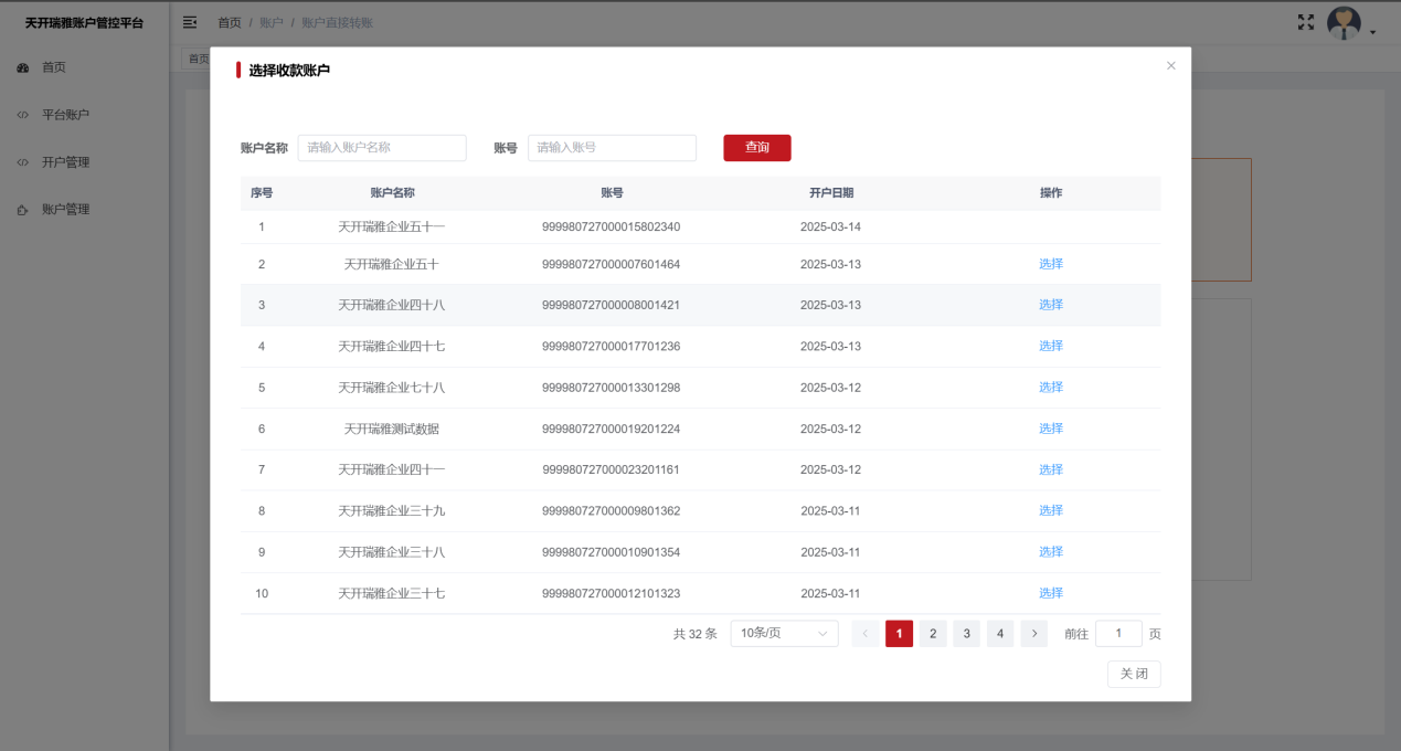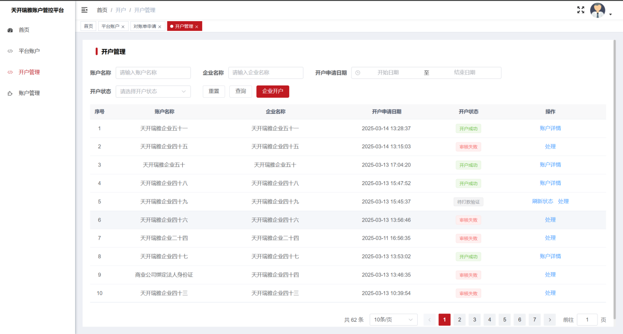 系统具备多层次账户结构,支持母账户与子账户(虚拟账户)的分层管理。用户可通过“开户管理”模块完成企业绑卡开户、非绑卡开户及二次开户,满足不同业务场景下的账户设立需求。开户过程中集成联行号查询与小额打款验证机制,确保账户信息的准确性与安全性。