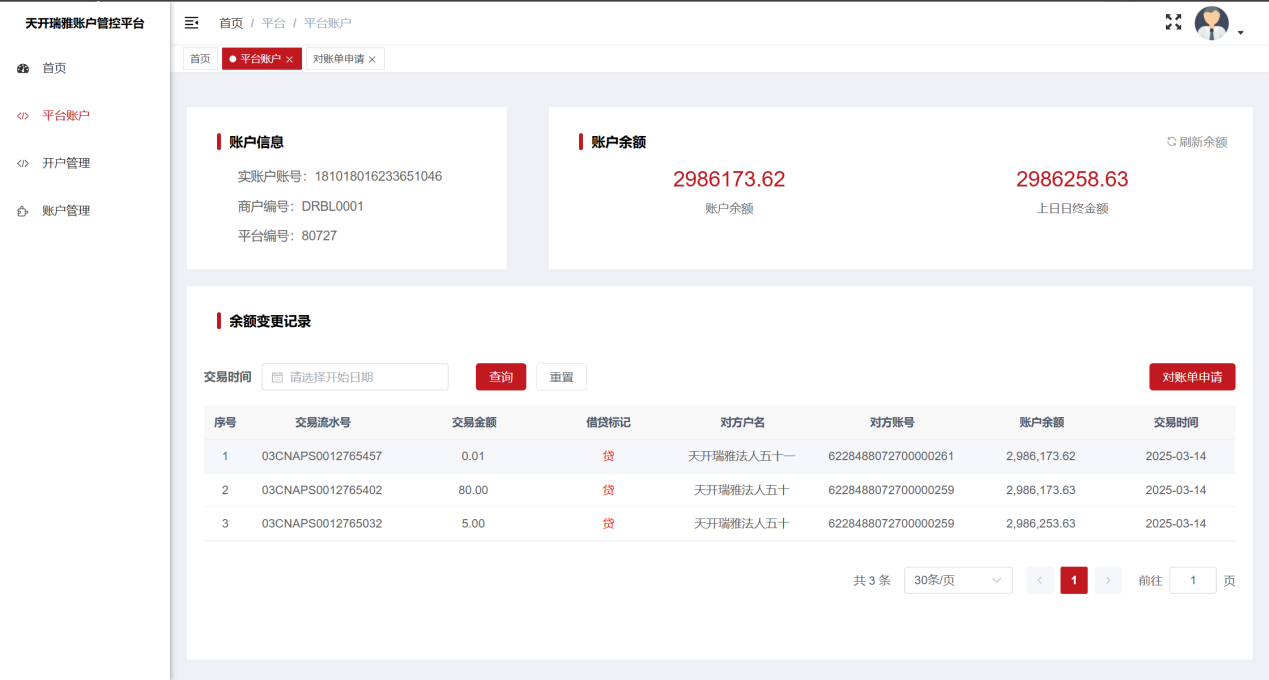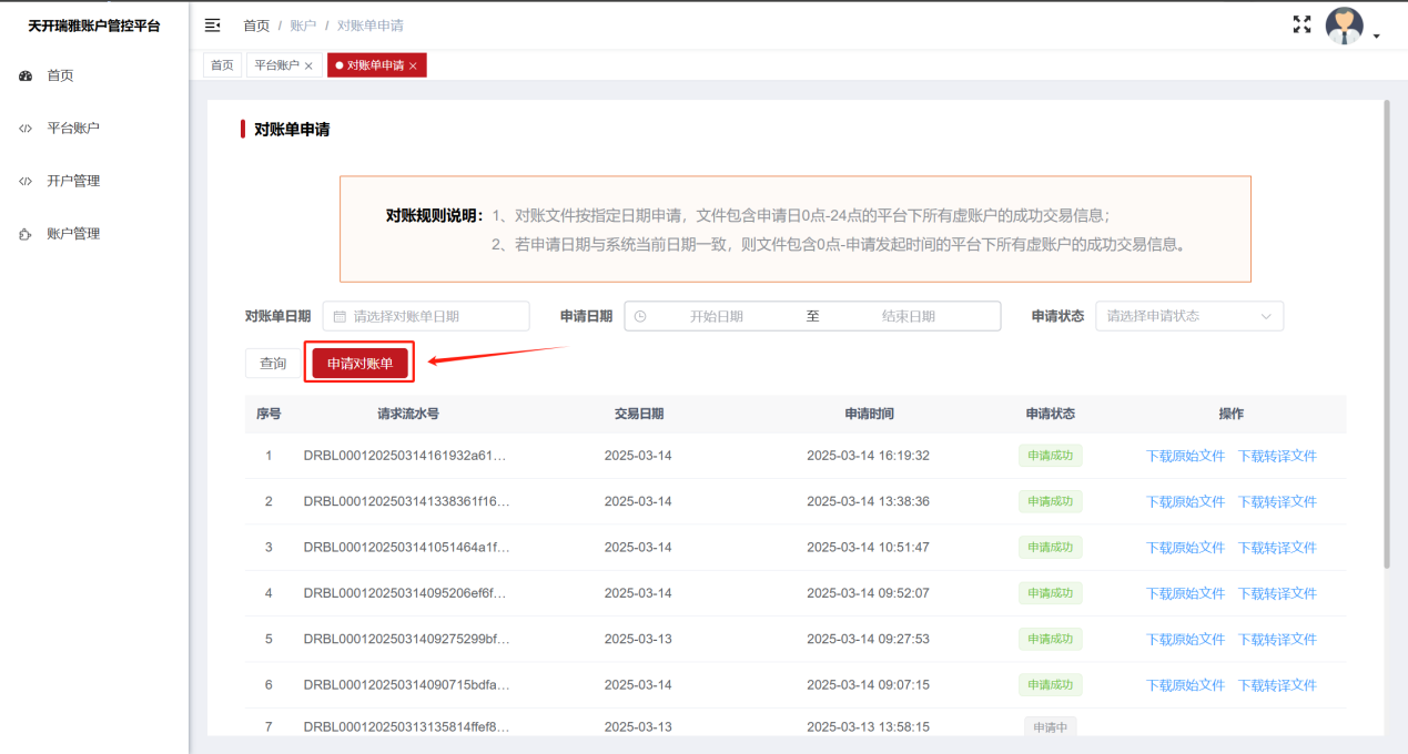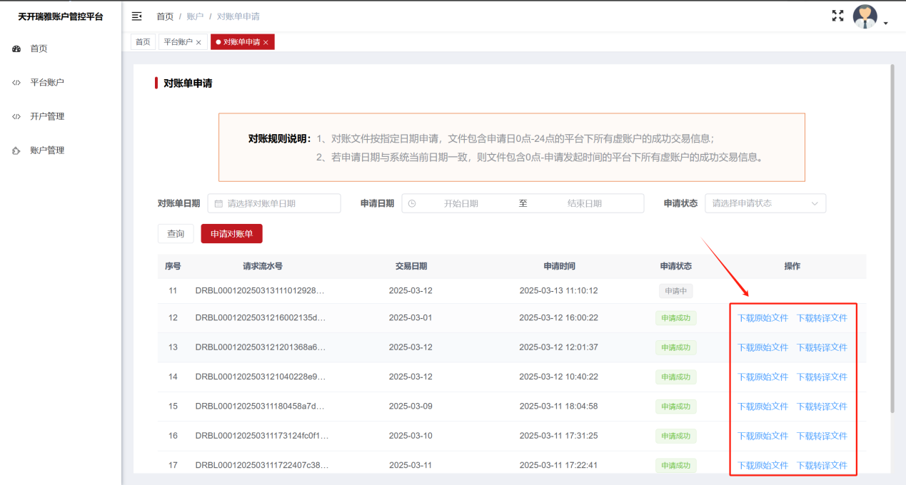 系统还提供“平台账户”功能,用户可实时查询母账户余额与变更记录,并申请下载对账单文件,支持原始TXT与转译Excel格式,满足企业财务对账与归档需求。