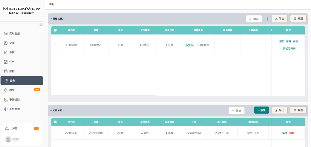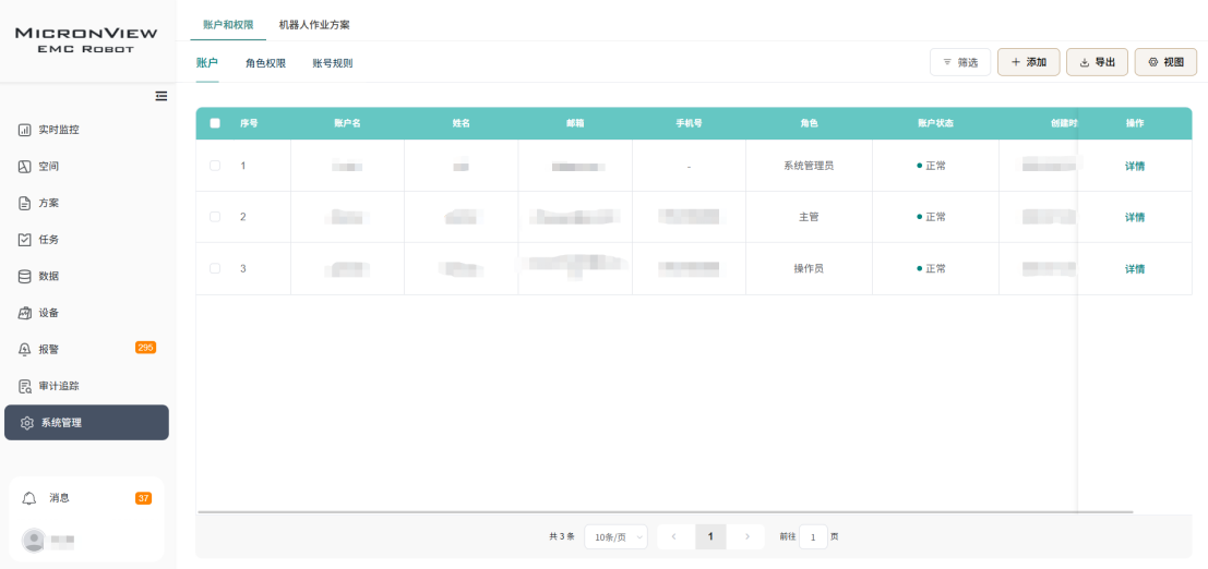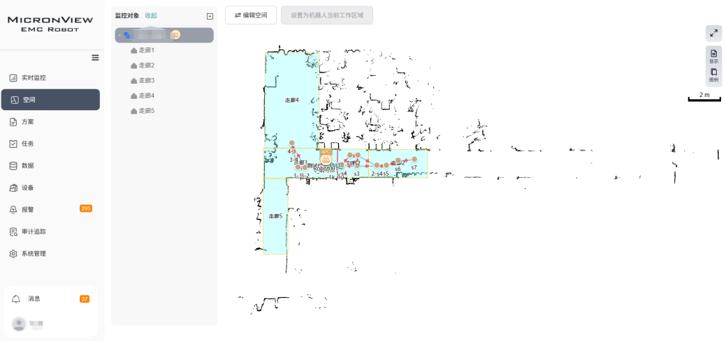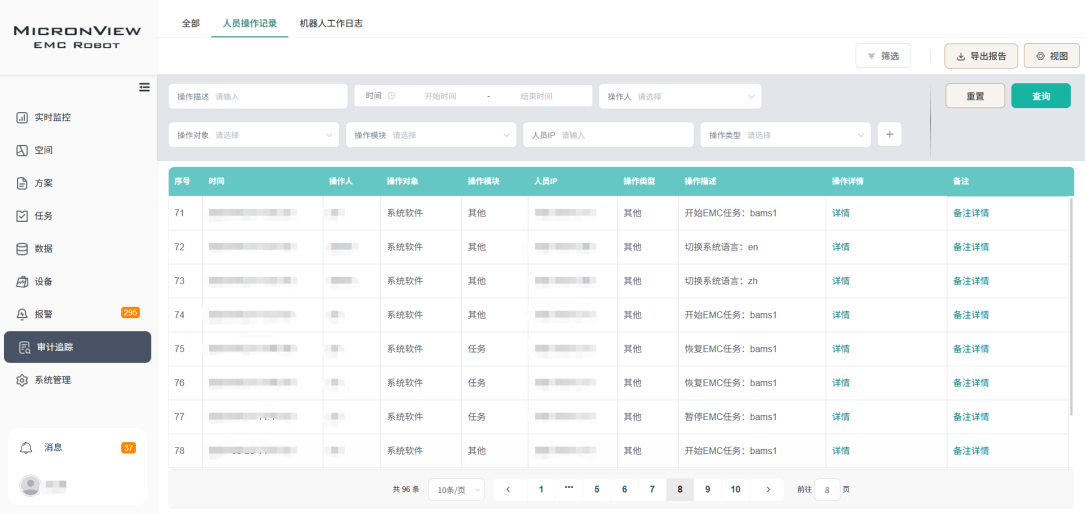 实时监控模块能够动态追踪运行中任务的实时信息,包括任务与机器人的实时状态、实时进度、实时数据、实时报警等信息;空间模块支持导航地图构建与维护,以及采样位点设置;任务模块实现各类采样任务的创建与维护,以及历史任务的查询;数据模块提供采样结果数据的查询、统计、趋势分析及导出功能;设备模块用于对机器人及其搭载功能单元的管理与状态监控;报警模块支持报警消息的实时推送推送、查询、处理;审计追踪模块会记录用户关键性操作日志并提供操作详情的查询,同时也会记录机器人在执行任务过程中的自主行为日志;系统设置模块包括用户、角色权限、账户规则、机器人作业设置等的管理。
