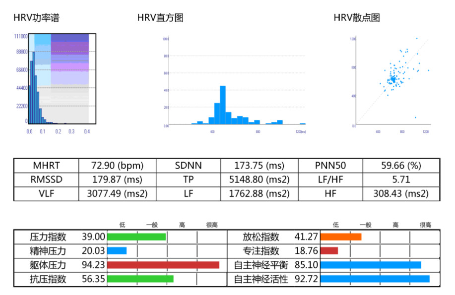 心率变异分析法能直观反映自主神经活性,交感神经与副交感神经的平衡性,是国际公认测量精神压力的最佳方法。