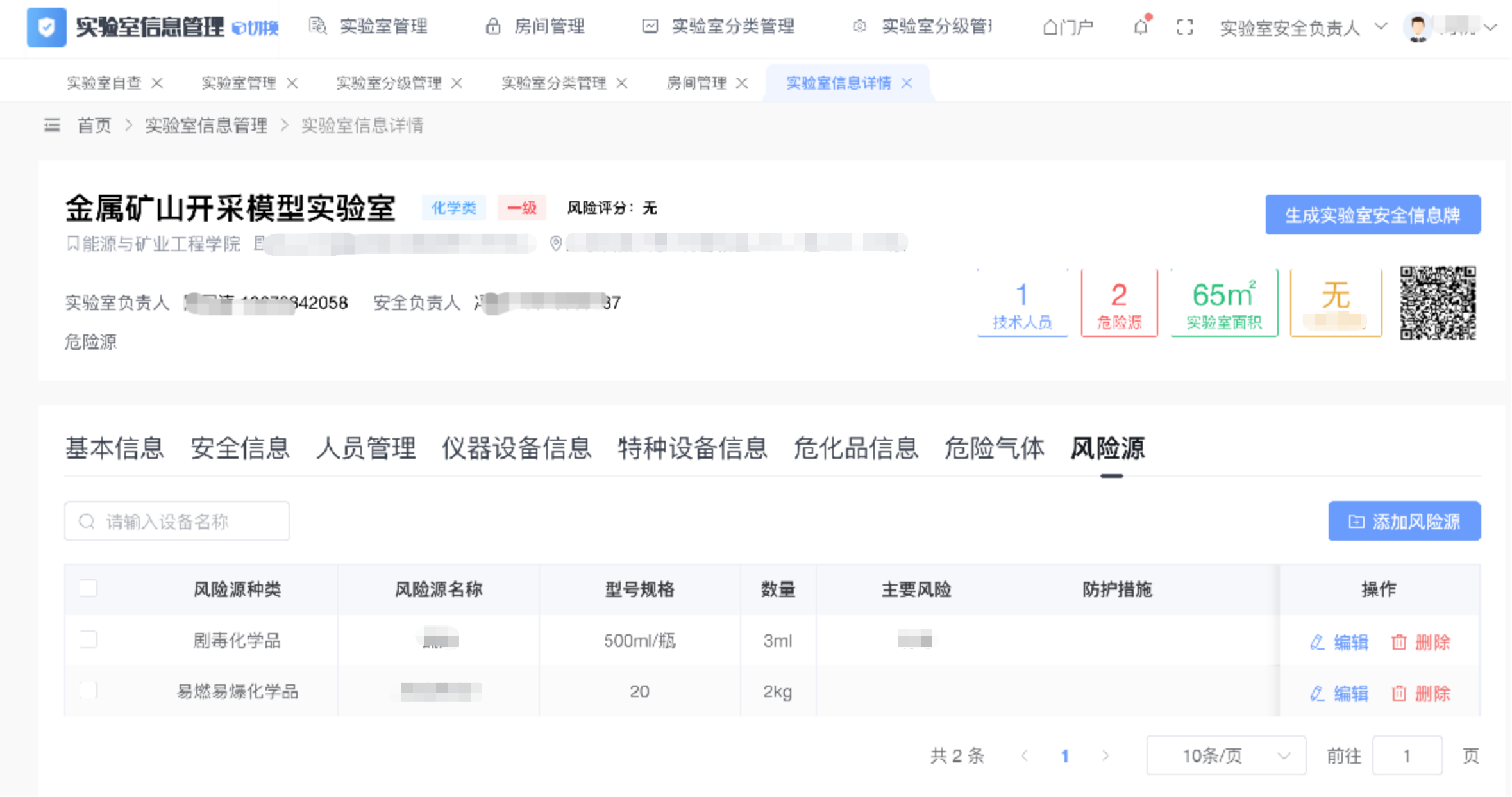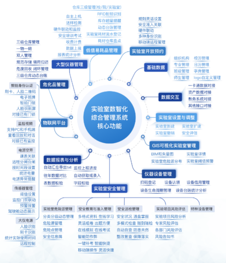 系统功能架构全面而精细,涵盖用户服务管理门户、实验室基础信息管理、实验室设置与调整、安全风险分级管控、仪器设备全寿命周期管理、低值易耗品管理、危化品全链条监管(含采购、入库[存储禁忌预警]、存储[库存预警、有效期预警]、使用、废弃及危废处理)、大型仪器共享与预约、智能化物联网集成管理等多个模块。尤为突出的是其实验室安全管理系统,内嵌安全教育考试与准入机制、常态化安全检查管理、实验室(项目)风险评估、气体钢瓶管理系统、特种设备管理系统、安全设施联动控制(如风机、气体报警器等)以及与其他业务系统的深度协同,真正实现“事前预防—事中监控—事后追溯”的闭环管理。