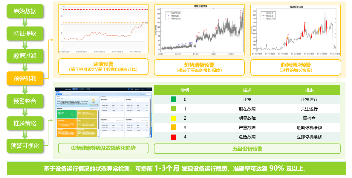 构建“原始数据-特征提取-数据过滤-预警机制-预警整合-推送可视化”全流程预警体系,支持阈值预警、趋势增幅/增速预警,设置0-4级五级设备预警等级,实现电机、泵、风机三大类设备14项核心部件的劣化趋势跟踪与提前预警;