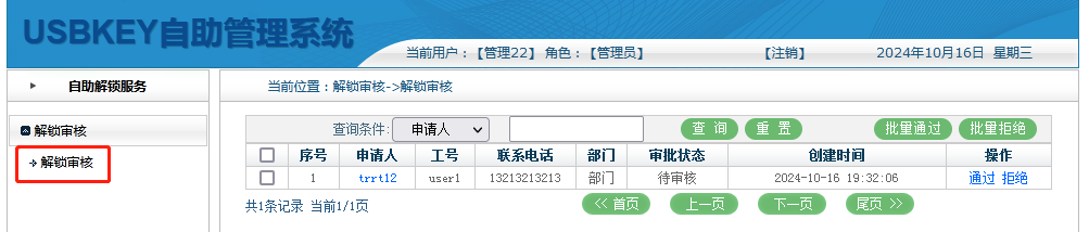 解锁审核:解锁审核提供查询、审批通过、拒绝审批、批量通过、批量拒绝等操作。