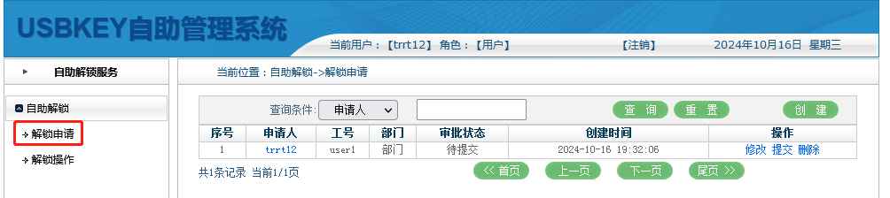 用户解锁申请:提供用户新建、修改、删除和查询解锁申请。新建和修改解锁申请时,用户工号从智能密码设备中进行读取,减少用户输入导致的错误;可以指定解锁操作的审核人,易于管理;提交申请时验证智能密钥钥匙和登录人是否是同一人,保证解锁申请安全。