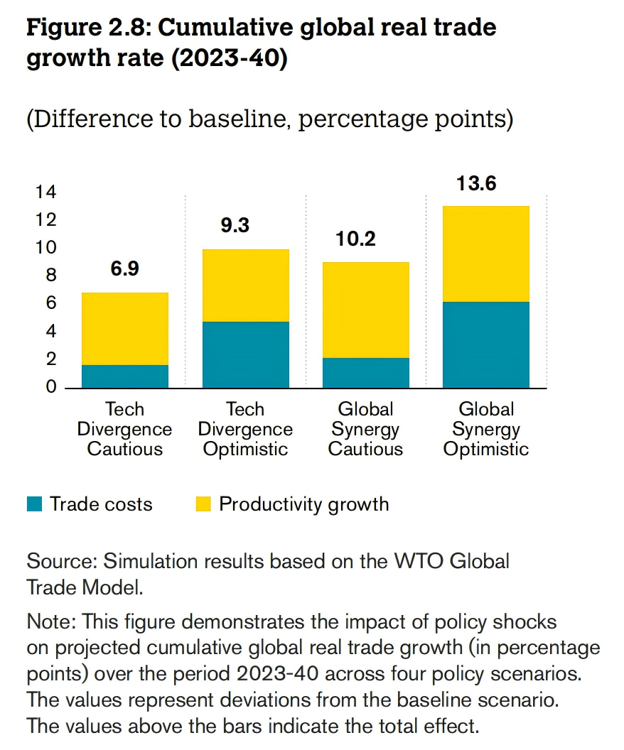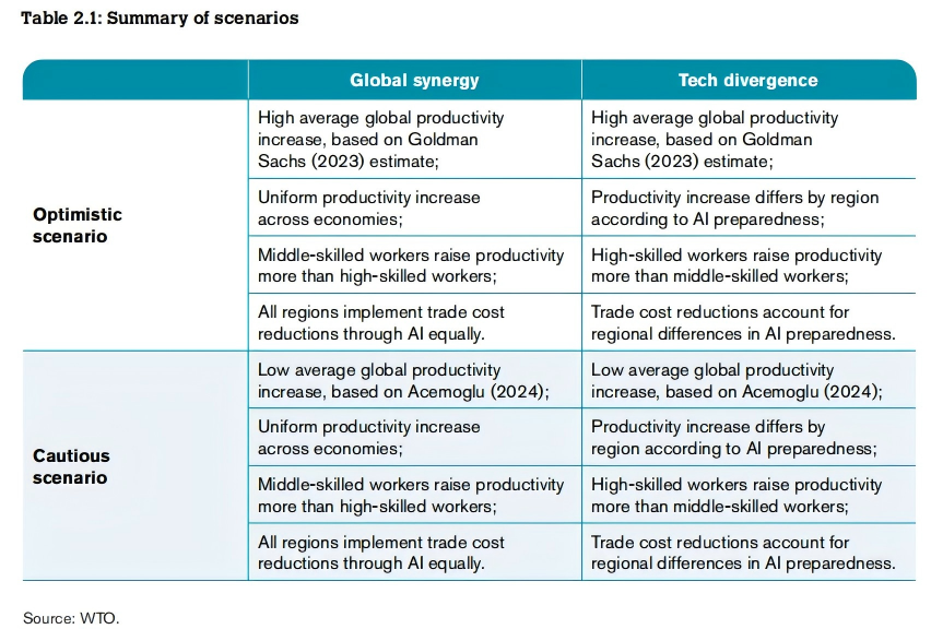 世界贸易组织(WTO)的一项专题研究中,采用全球贸易模型针对未应用人工智能的基准情景,引入了劳动生产率提升和贸易成本降低两大冲击因素,预测人工智能对国际贸易格局的潜在影响。研究设置了四个不同维度的场景:人工智能对生产力的影响程度(乐观或谨慎),以及经济体间及不同技能劳动者之间的融合空间(协同效应或分化趋势),包含以下四种情况: