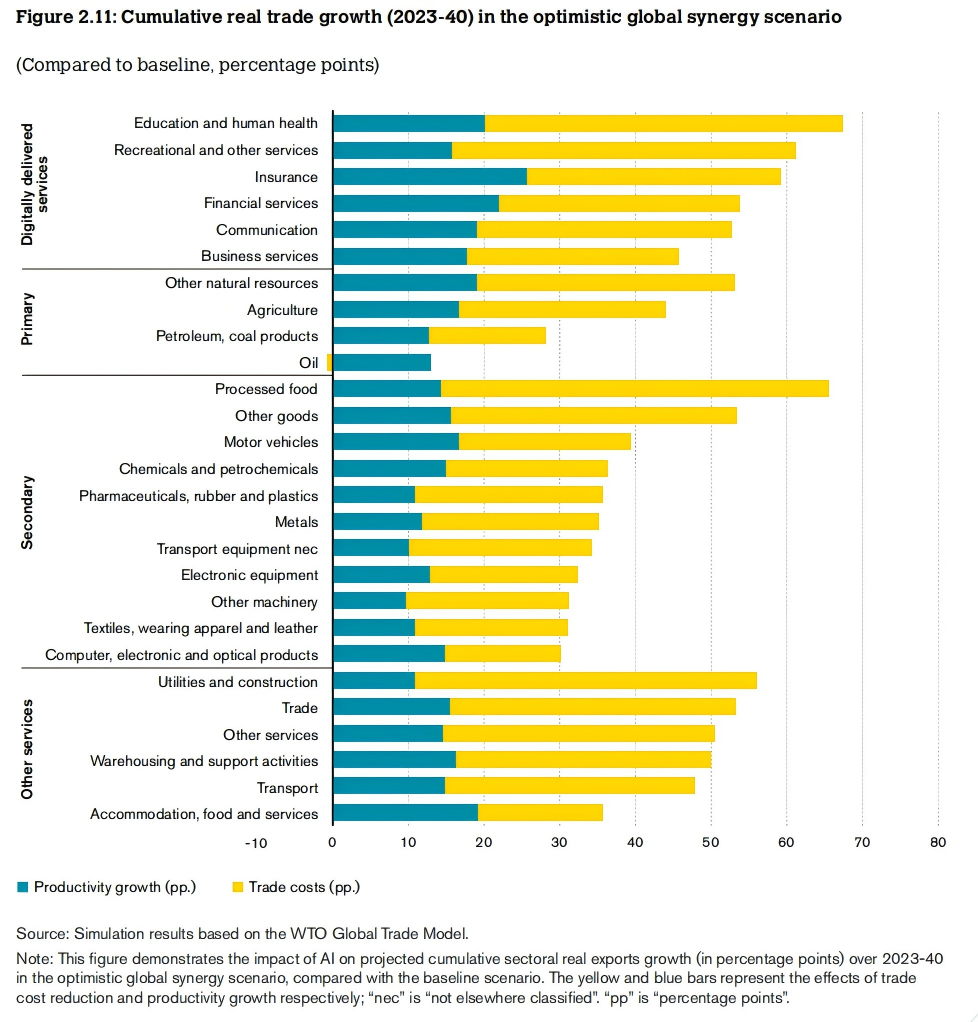 在人工智能技术的驱动下,数字交付服务将经历最高的贸易增长。该研究将贸易增长预测划分为四大领域:第一产业(农业与矿业)、第二产业(制造业)、第三产业中的数字服务(数字化交付服务)以及其他服务。人工智能技术预计将对数字化服务领域产生最大推动作用,而农产品出口增幅预计最为有限。在乐观的“全球协同”效应情景下,数字化服务领域的累计增长率预计将达近18个百分点,成为增长最快的板块。人工智能对实际贸易增长的影响在行业内部也存在差异。正如图2.11所示,在乐观的“全球协同”情景下,教育、医疗、娱乐和金融等数字交付服务,以及食品加工业等制造业预计将实现显著的贸易增长,这主要由贸易成本的下降推动。相反,与自然资源开采(如石油)相关的行业,以及纺织业、计算机、电子和光学产品等制造业,预计因人工智能的作用而增长有限。