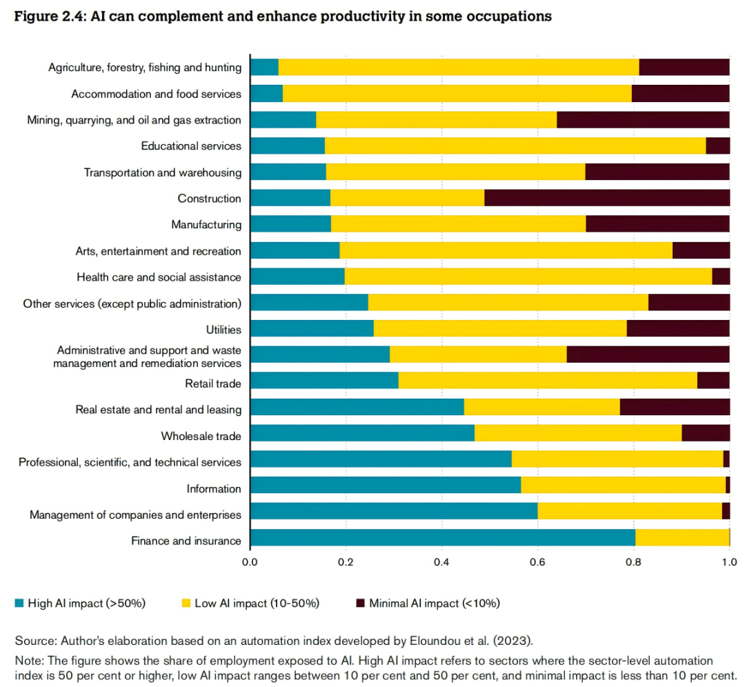 人工智能将提高全球经济所有部门的生产率。高盛集团(2023)预测,若生成式AI得到广泛应用,未来十年间整体劳动生产率年增长率将提升约1.5%,这一增幅与电动机、个人电脑等早期变革性技术带来的提升幅度不相上下。WTO于2024年发布的《Trading with Intelligence: How AI Shapes and is Shaped by International Trade》报告中指出,人工智能可以显著提升生产力,让现有资源发挥更大作用,从而降低生产成本,并进一步推动不同服务领域间的贸易活动更加活跃。尤其是在依赖人工流程的金融保险、管理咨询、信息科技及专业服务等服务领域,AI能有效辅助人类提升效率、精准度和个性化服务(即根据个人偏好定制产品、服务或体验的能力)。在生成式人工智能的应用领域,相较于未使用该技术的同行,其能将业务顾问的工作效率提升高达40%。针对某呼叫中心5000名负责复杂客户支持的员工开展的研究表明:在获得AI助手支持的团队中,技能最薄弱或资历最浅的员工展现出最大化的效率提升,而使用Chat GPT的大学毕业生则在工作效率、任务完成质量和工作满意度方面表现更优。值得注意的是,技能水平较低的员工从使用Chat GPT中获益最为显著。