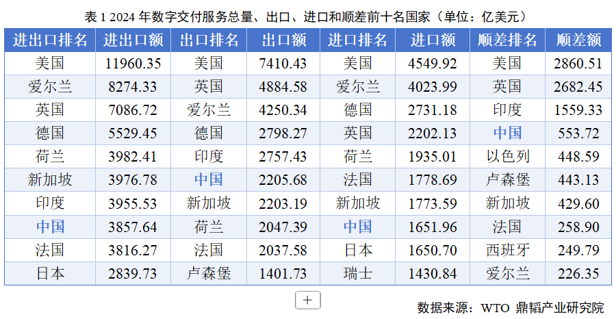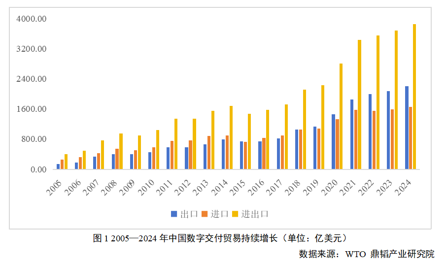 Industry research近年来,中国数字交付贸易实现显著增长,成为全球服务贸易格局中不可忽视的力量。2005至2024年间,中国数字交付服务进出口总额从401.27亿美元跃升至3857.64亿美元,复合年均增长率达12.65%,增速远超全球平均水平。2024年,中国数字交付服务出口规模位列全球第六,顺差规模跻身全球第四,展现出强劲的国际竞争力。在结构上,其他商业服务与ICT服务共同占据超过四分之三的贸易份额,成为顺差扩张的核心驱动力;同时,离岸服务外包的蓬勃发展进一步夯实了数字交付出口的基础。然而,知识产权领域持续存在的逆差,也折射出中国在高端技术引入与自主创新之间的平衡与挑战。在本篇观点中,鼎韬系统梳理了中国数字交付贸易的发展情况与主要特征,探寻其背后的动力与未来方向。