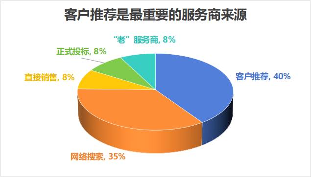 还有6%的推荐来自甲方采购决策人的熟人和朋友,特别是有2%的服务商是甲方采购决策人以前在其他公司工作中合作过。
