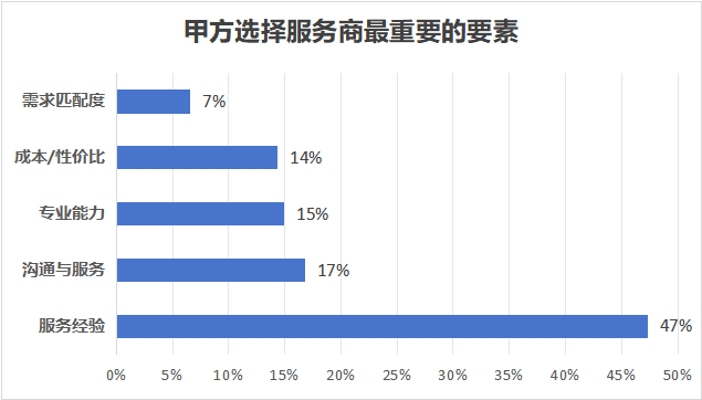 调研中,“在最终选择服务商时最重要的因素”中,有五大核心要素最终决定了甲方的选择,其中有接近一半(47%)的甲方认为服务经验(客户),即“给谁做过”是选择服务商最关键的决定因素。