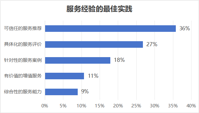 其中有36%的甲方认为来自服务商历史客户的口头或者书面推荐代表了对该服务商的最高认可,是更加值得信赖的“服务经验”。而27%的甲方则更看重历史客户对服务商的具体服务评价,特别是针对响应速度,沟通过程,专业能力,准时交付和使用效果等无法预知服务要素的评价,代表着更为具象化的“服务经验”。