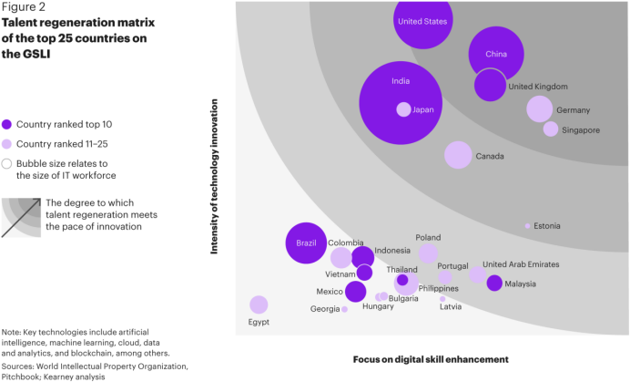 因此,一个国家重新培训和重新部署劳动力以应对不断变化的市场需求和技术中断的能力是提高其作为离岸商业服务地点吸引力的关键,人才重置将是这一转变的支柱。所谓人才重置(talent regeneration),被定义为通过提升劳动力技能来弥合技术中断造成的供需缺口,从而创造持久价值的能力。一个国家行动越快,就越有能力创造作为服务中心的持久价值。