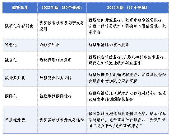 同时,目录通过删除领域定义中的限制性表述优化服务生态,例如“电子商务平台服务”删除“不包括电子商务代运营服务”,“检验检测服务”删除强制检测排除条款,扩大服务外包产业覆盖面,提升市场活力。