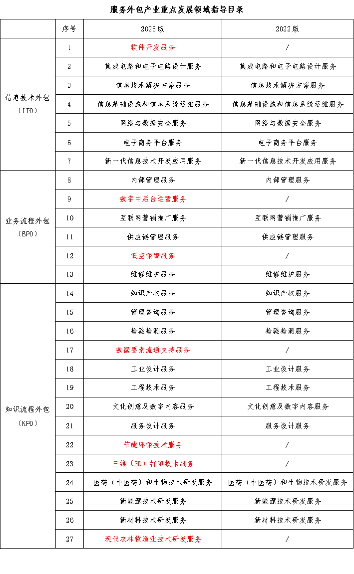 Policies and regulations2025年10月,商务部联合多部门发布《服务外包产业重点发展领域指导目录》(2025年版)(以下简称《2025版目录》),相较2022年版本(以下简称《2022版目录》)新增软件开发服务、数字中后台运营服务、低空保障服务、数据要素流通支持服务、节能环保技术服务、三维(3D)打印技术服务、现代农林牧渔业技术研发服务等7个重点领域,调整了信息技术解决方案服务、信息基础设施和信息系统运维服务、网络与数据安全服务、电子商务平台服务、新一代信息技术开发应用服务、互联网营销推广服务、供应链管理服务、维修维护服务、知识产权服务、管理咨询服务、检验检测服务、工业设计服务、工程技术服务、文化创意及数字内容服务、医药(中医药)和生物技术研发服务、新能源技术研发服务等16个领域范畴,总领域数达27个。从《2022版目录》到《2025版目录》,清晰地勾勒出我国服务外包产业向数智化、绿色化、融合化、生态化纵深发展的战略路径。《2025版目录》通过新增领域与细化范畴,积极响应了技术变革与全球市场需求,旨在强化服务外包作为新质生产力引擎的角色。