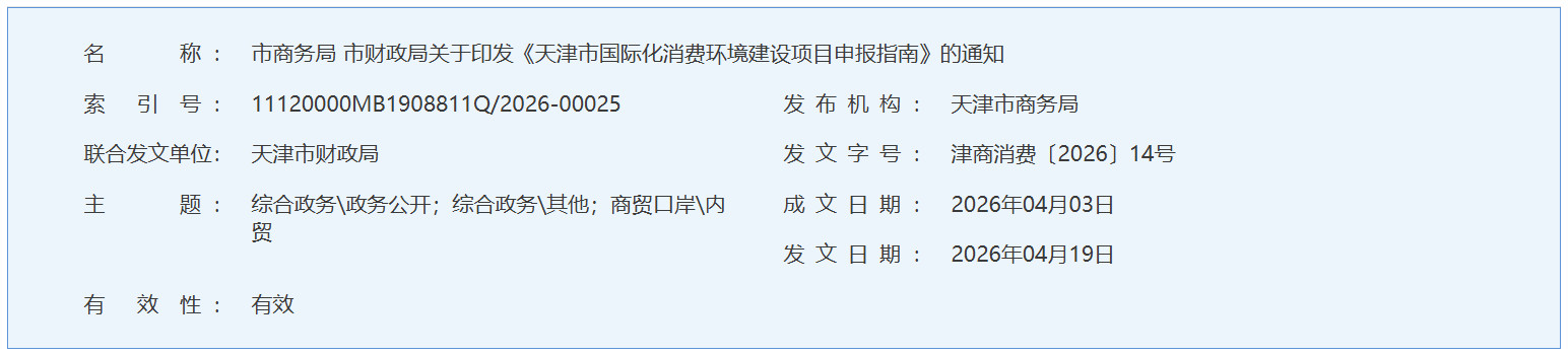 为贯彻落实《财政部 商务部关于开展国际化消费环境建设工作的通知》(财建〔2025〕342号),按照市委、市政府有关要求,现制定印发《天津市国际化消费环境建设项目申报指南》,请组织做好相关申报工作。